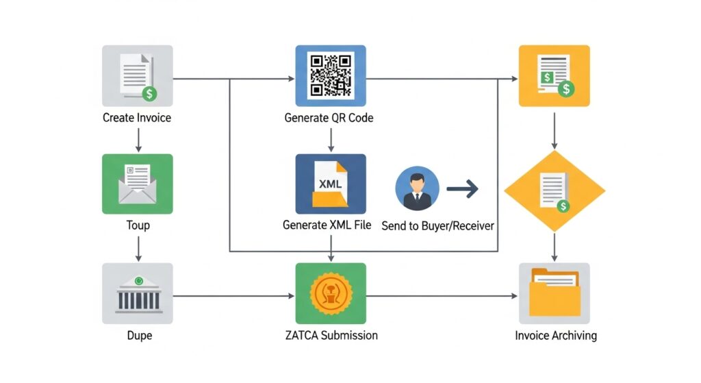 Process FlowGenerate a compliant e-invoice and store it locally.Generate invoice -> Send to ZATCA for clearance -> Receive cryptographic stamp -> Send to customer.